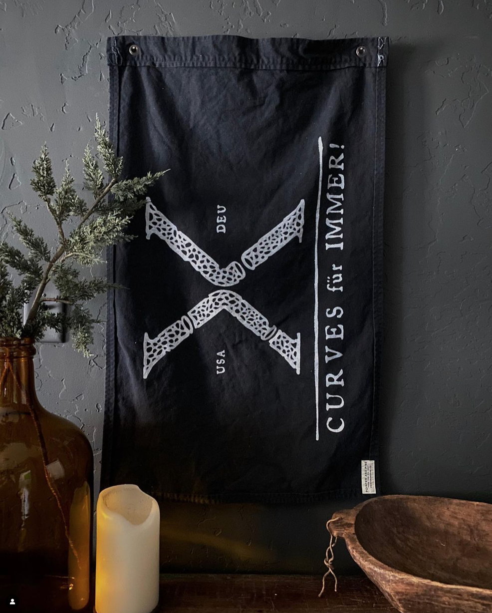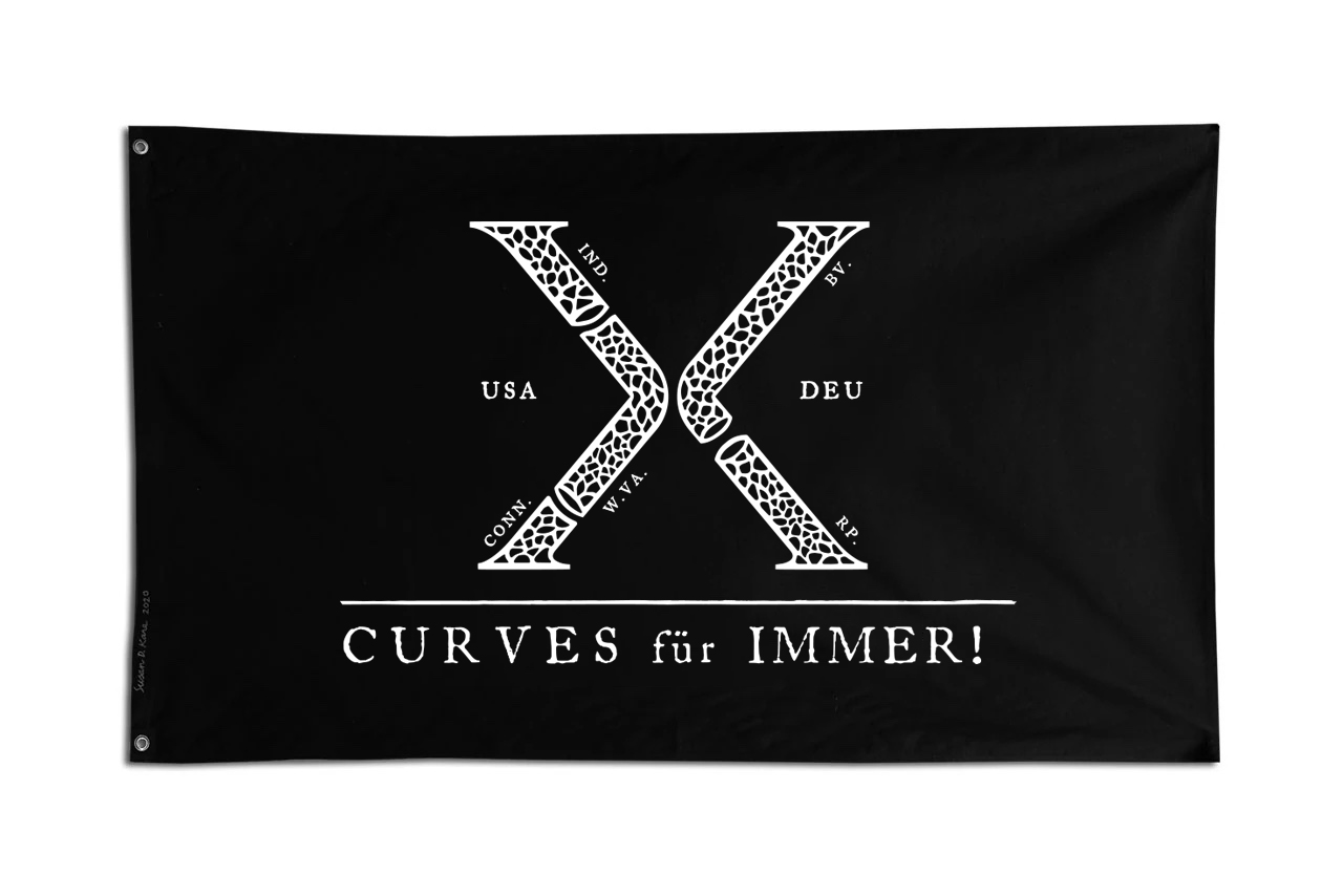One of the most famous rally cries in history was the “Join or Die” graphic designed by Benjamin Franklin as a way to unite the colonies in the cause for independence. The graphic depicts eight segments of a snake, each representing a colony in a way that emphasizes the importance of colonial unity. It would later become a symbol for freedom in the Revolutionary War. I viewed the major companies that it would take to make X-Series a reality in a similar fashion. Independently, we were severed and would not achieve our goal. But, together, we could make this truly ground-breaking product a reality. I took the X-Series logo and had Patrick hand illustrate the scales and the segments, similar to the serpent in Franklin’s design. I broke the X into two major sections, symbolizing the two major countries of origin needed to pull this off, Germany and the United States. From there, each segment within the section was broken down by the headquarters of the major players involved in the project. Below it we inscribed the caption “Curves für Immer!,” which is an English/German hybrid phrase meaning “Curves Forever!;” a nod to X-Series’ curved design. I really loved how this concept came out, and we had this flag hanging proudly in our office as a daily reminder of what we were working towards.